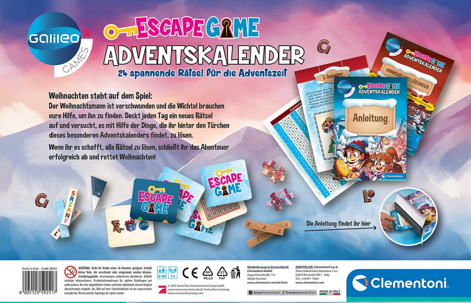 Der klassische Adventskalender wird zu einem interaktiven Spiel – hinter jedem Fenster verbirgt sich ein Rätsel oder ein Hinweis, der dem Kind hilft, seine Mission zu erfüllen und den Escape-Room zu verlassen!24 Rätsel für Kinder, ab 8 Jahren, Clementoni