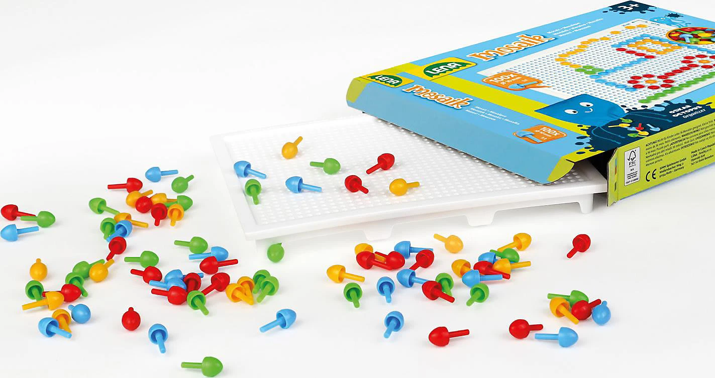 Für alle kreativen Künstler und Designerinnen: Mit diesem farbenfrohen und umfassenden LENA® „Mosaik Set color“ steht der Gestaltungsfreude nichts mehr im Weg. Mit den 100 bunten Steckern lassen sich auf der Steckplatte unzählige kleine und große Werke schaffen. Und ganz nebenbei fördern die Mosaik-Spiele die Kreativität, Konzentration und die Feinmotorik.