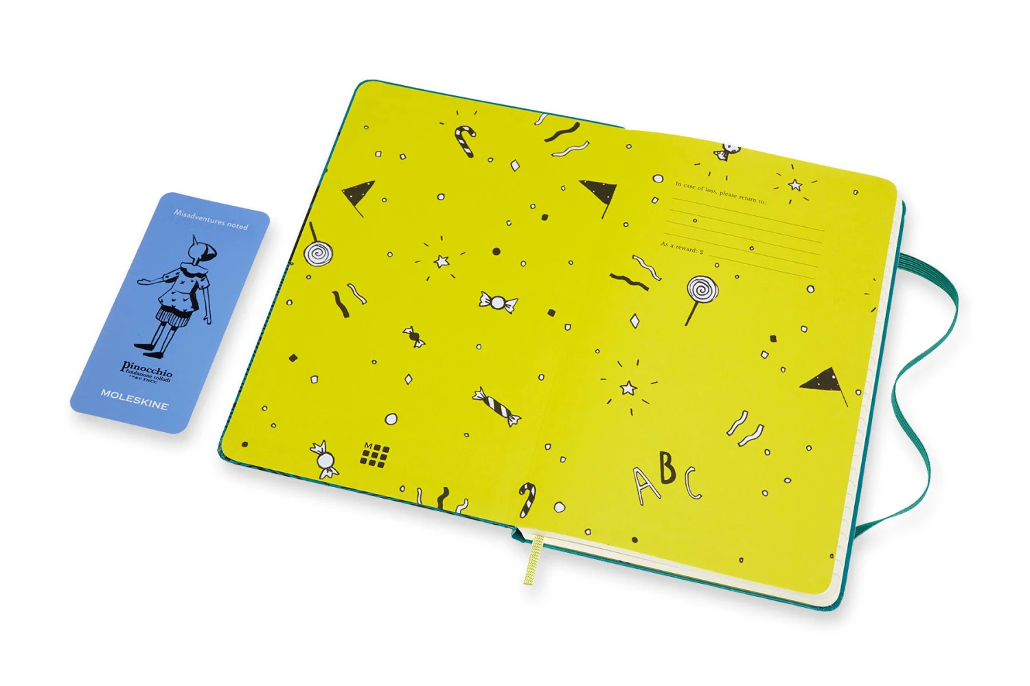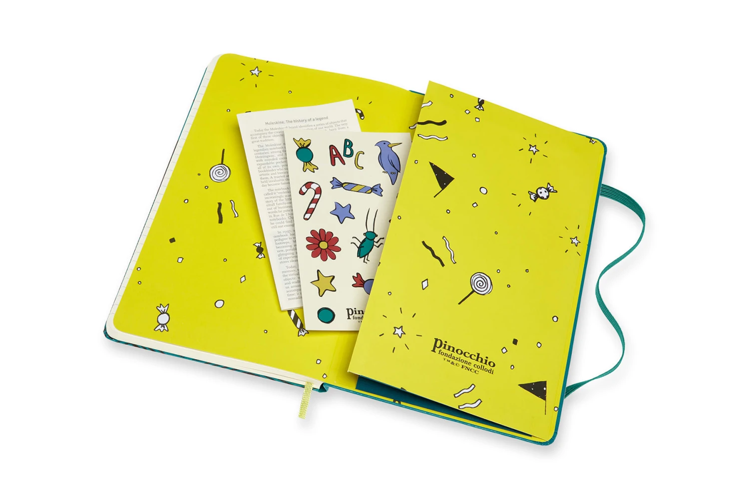 Jedes der 4 farbenfrohen Notizbücher der Kollektion zeigt Pinocchio in einem anderen Schlüsselmoment seiner allseits geliebten Geschichte, stets mit einer anderen Figur: der Feuerfresser, die Katze, die Fee und der Hundsfisch.