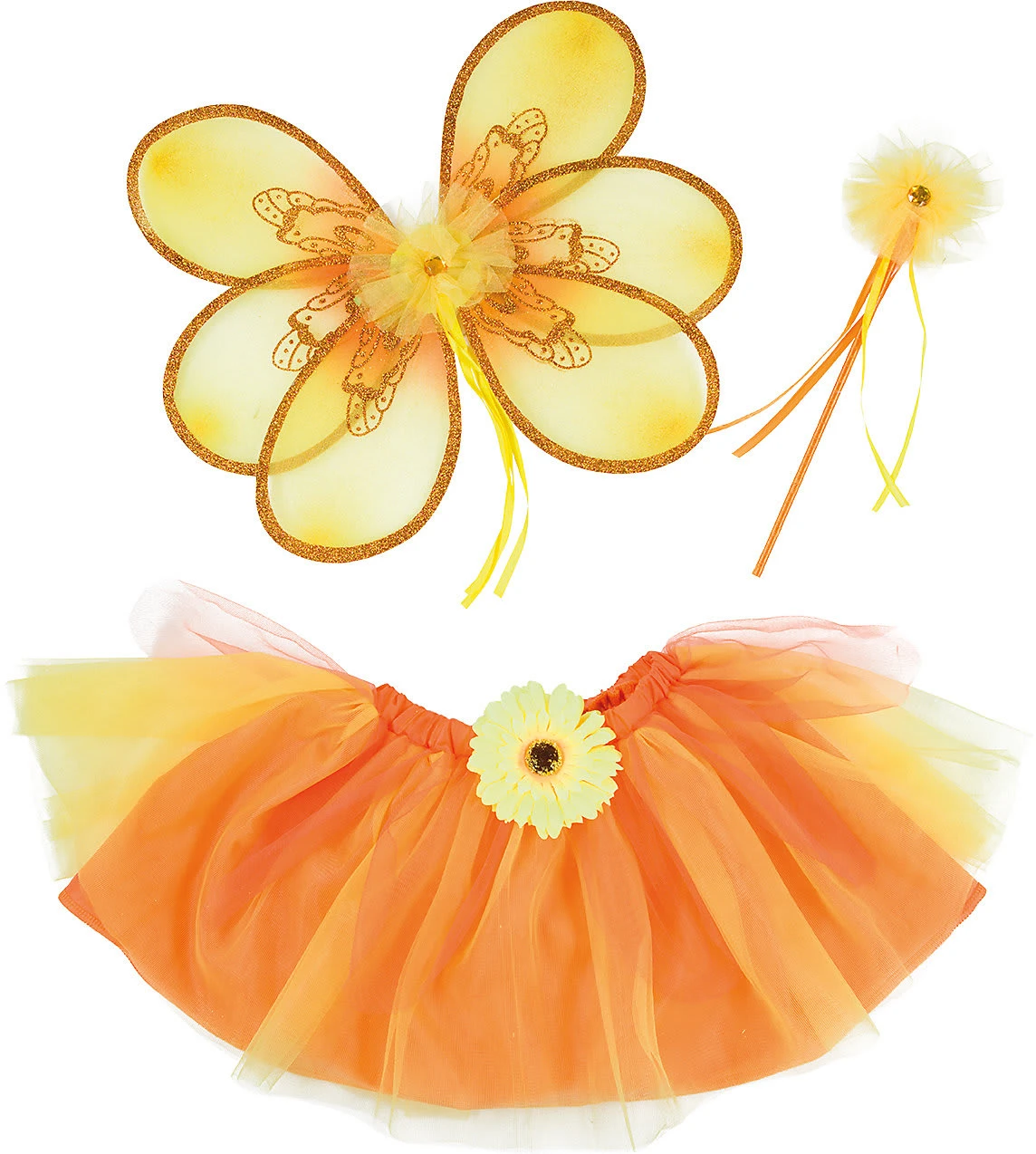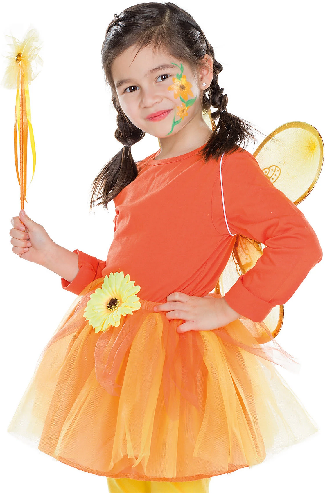 Mit diesem Kostüm gelingt der Auftritt als „Sonnenblumenkind“ bei der nächsten Verkleidungsparty ganz bestimmt. Das bezaubernde Set begeistert mit einem niedlichen Rock mit Tüll-Lagen, den passenden Flügelchen und einem niedlichen Zauberstab.