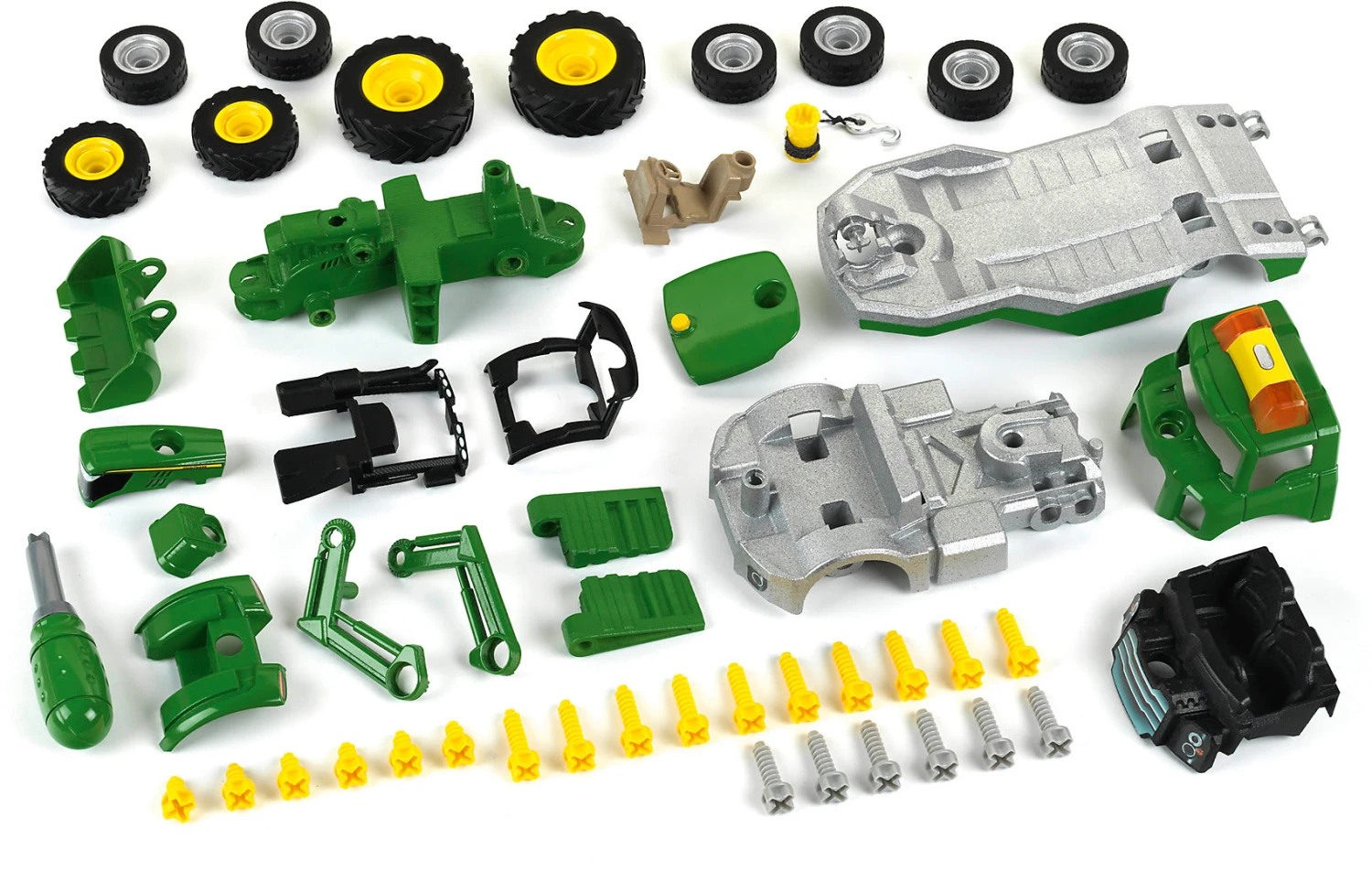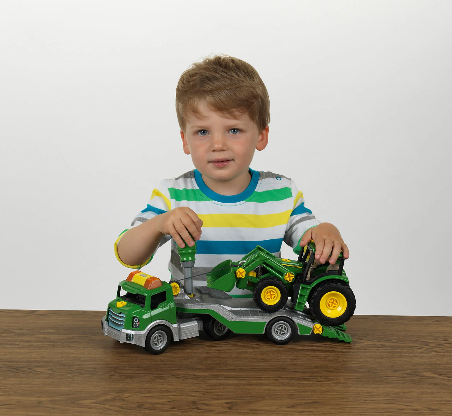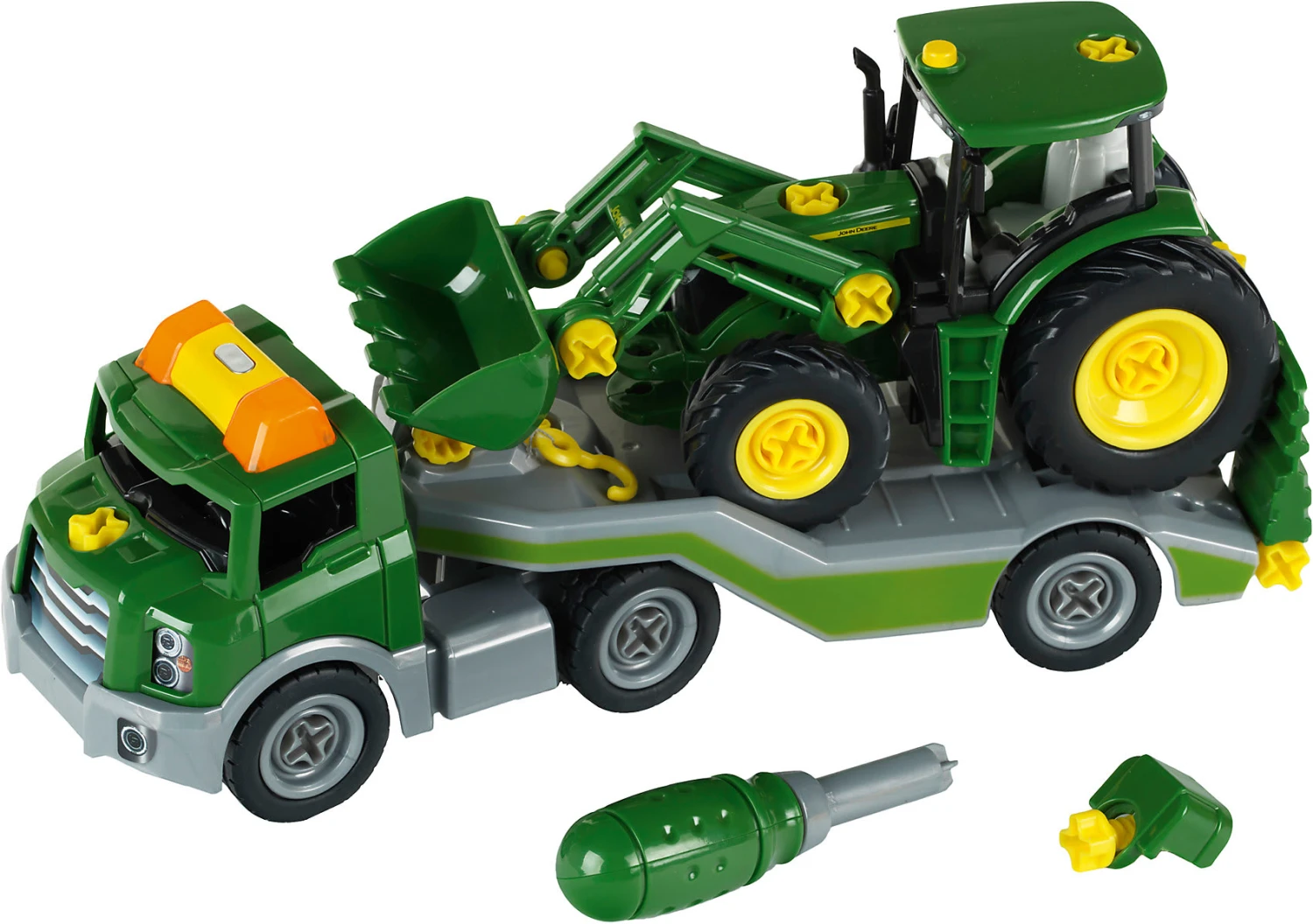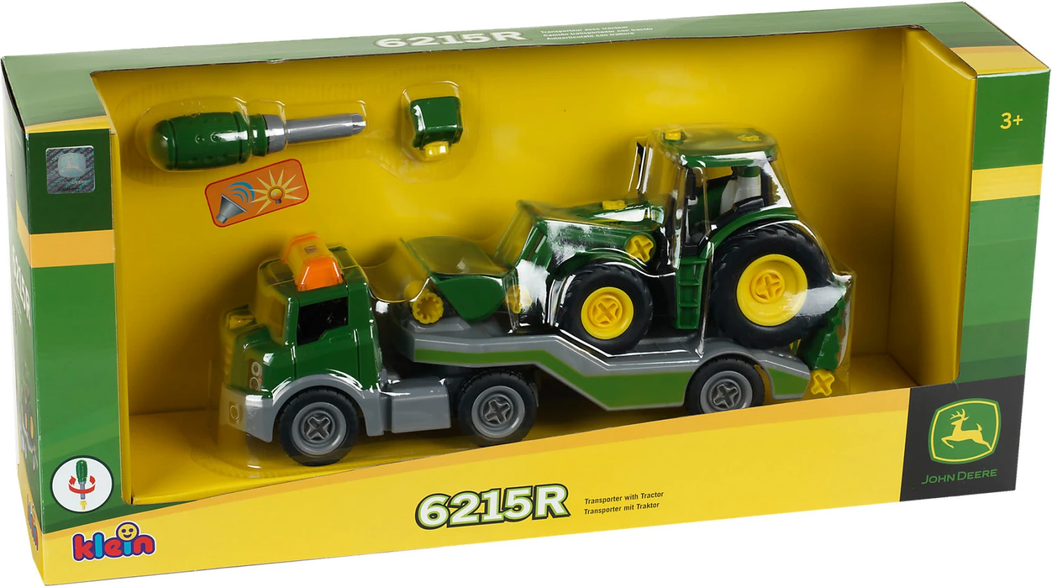 Entdecke die neue John Deere CONSTRUCTION Line. Baue deinen eigenen John Deere Traktor 6215 R im Maßstab von ca. 1:24. Nimm das Fahrgestell, montiere die Reifen, den Sitz, das Führerhaus und die Motorhaube. Bau deinen Transporter zusammen. Das Fahrgestell mit dem Führerhaus und die Räder an den Auflieger. Ziehe deinen Traktor mit der Seilwinde auf den Transporter. Licht und Sound an! Jetzt kann es losgehen! Der neue John Deere Traktor 6215 R kann ausgeliefert werden!