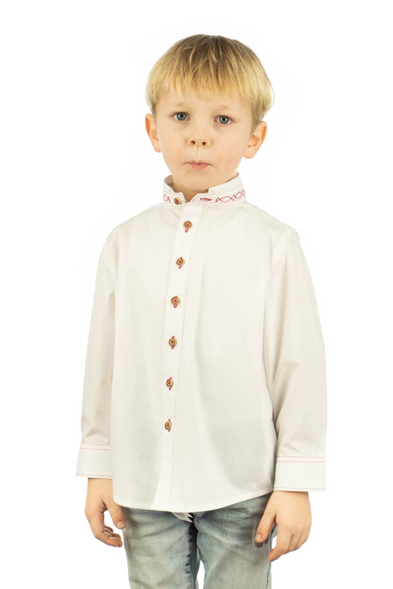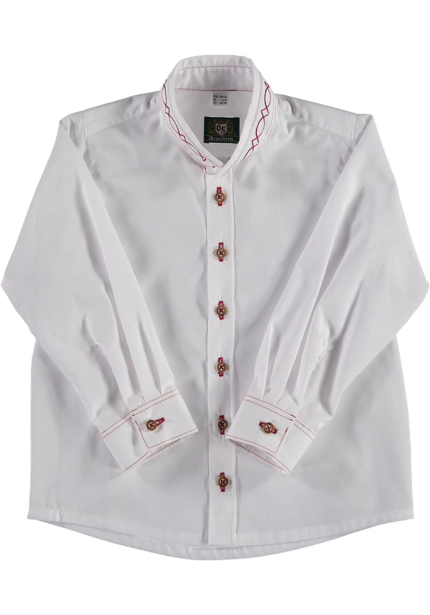 Mit Jeans oder mit Lederhose kombiniert – in diesem Trachtenhemd kommt der Nachwuchs gerne mit zum nächsten Fest. Optisches Highlight: der mit rotem Kontrastgarn bestickte Stehkragen und die markante Knopfleiste mit Knöpfen in Hirschhorn-Optik. Erfreulich pflegeleicht und angenehm zu tragen ist das Baumwoll-Mischgewebe. Von klein bis ganz groß auf Lager, d.h. von Größe 74 bis Größe 182.